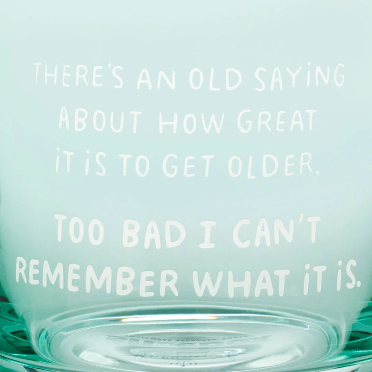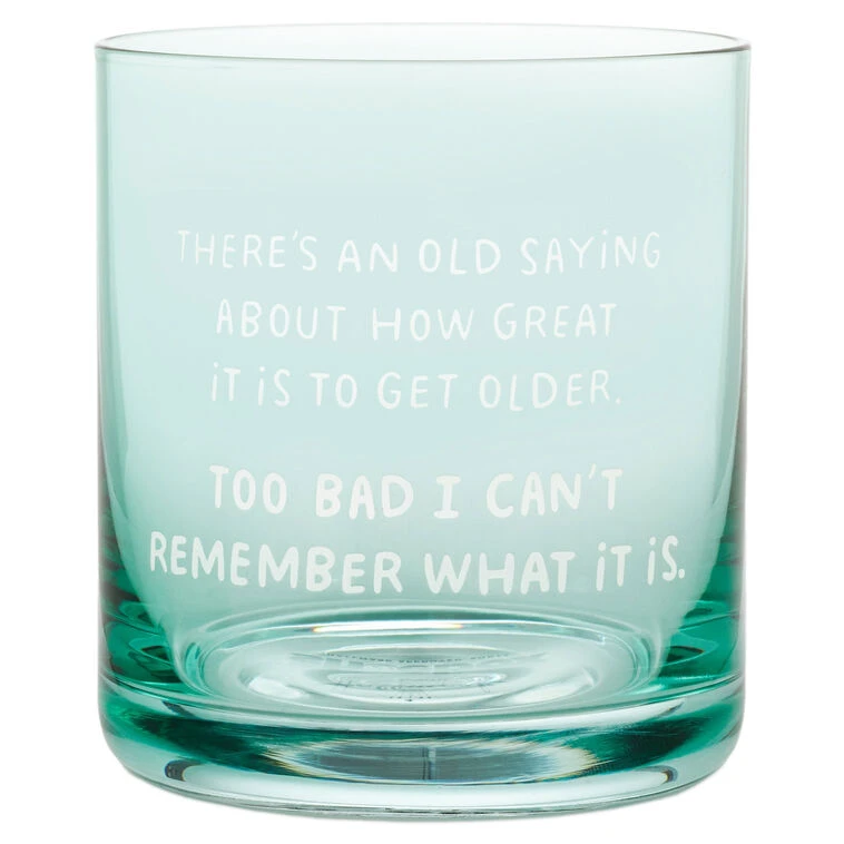 Make a drink that will impress upon your memories with this fun rocks glass in a green-tinted design. Printed with a funny message in white lettering, this lowball glass from Hallmark Shoebox adds a dash of bitter humor to the sweet cocktail you’ve created out of your long, full life. Pair it with other funny rocks glasses, stemless wine glasses and coasters for barware that’s outfitted to handle all the requirements of your friends and family with a shot of humor.