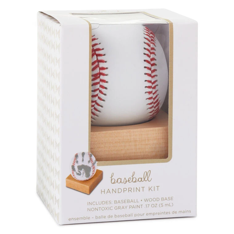 - Baseball handprint kit includes a baseball, non-toxic gray paint and a wood stand for display.