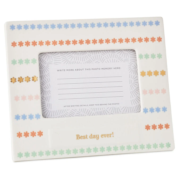 Turn a wonderful moment into a memory to keep forever with this festive picture frame to display it. The white photo holder is sized to fit a horizontal 4×6 picture and features rows of asterisk-shaped flowers in pastel shades of blue, coral, mint green, gold foil and pink. Fun frame is perfect for capturing a birthday adventure, a best friend, an engagement snapshot and more.