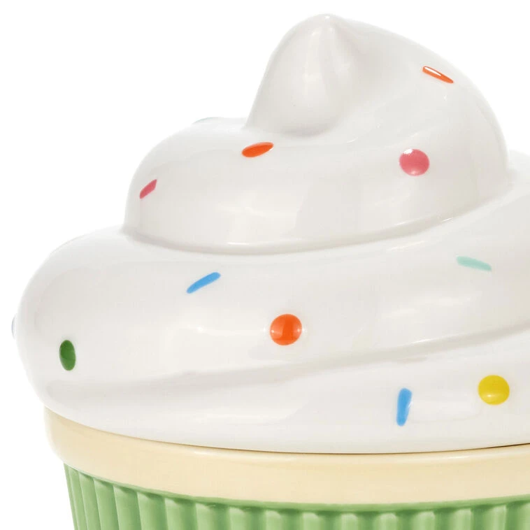 - Cupcake-shaped ceramic mug features a frosting lid and plays a song when the lid is lifted.