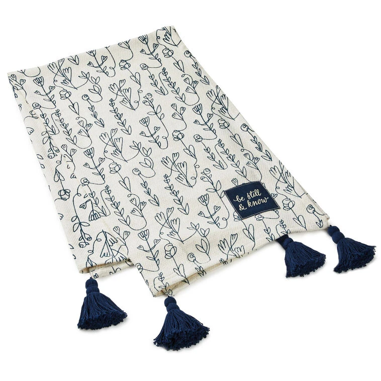 Let your faith blanket and comfort you whenever you snuggle under this woven cotton throw. This lightweight but snuggly blanket in soft ivory-colored cotton features vertical vines of indigo blue, a blue sewn-on patch with a simple Bible verse, and coordinating blue tassels on each corner. This charming throw blanket makes a lovely addition to your own home or a sweet housewarming gift or wedding gift for friends in faith.