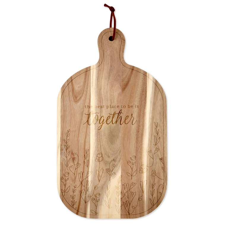 Make a charcuterie display extra cute with this etched wood serving board. Twining vines and a sweet message about togetherness make this server pretty enough to keep out all year round. And leather cording on the handle makes it easy to hang on any wall in your kitchen for quick access in meat and cheese emergencies—like unexpected guest arrivals. Rectangular wood server with rounded edges makes a lovely gift.
