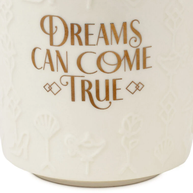 No need for rose-colored glasses when you sip your morning brew or afternoon tea from this elegant Disney Princess cup. White ceramic mug features an inspiring message in gold foil surrounded by embossed diamonds and designs from Disney’s animated films—a glass slipper from “Cinderella,” the enchanted rose from “Beauty and the Beast,” the magic lamp from “Aladdin” and a scalloped seashell from “The Little Mermaid.” A gold rim and a rich blue glazed interior add the perfect finishing touches to this feminine cup.