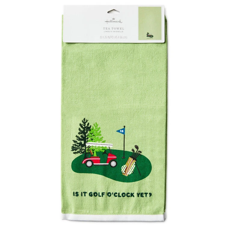 Tee up the fun with this cute golf-themed tea towel hanging in your kitchen. Grass-colored cotton dish towel features a putting green scene with a golf bag, golf cart and a flagstick in the foreground and two obstacles, er, trees, in the background. An embroidered message below the design asks an important question that only your resident golfer can answer. Avoid water hazards and keep your dishes and hands clean and dry with this fun and sporty towel.