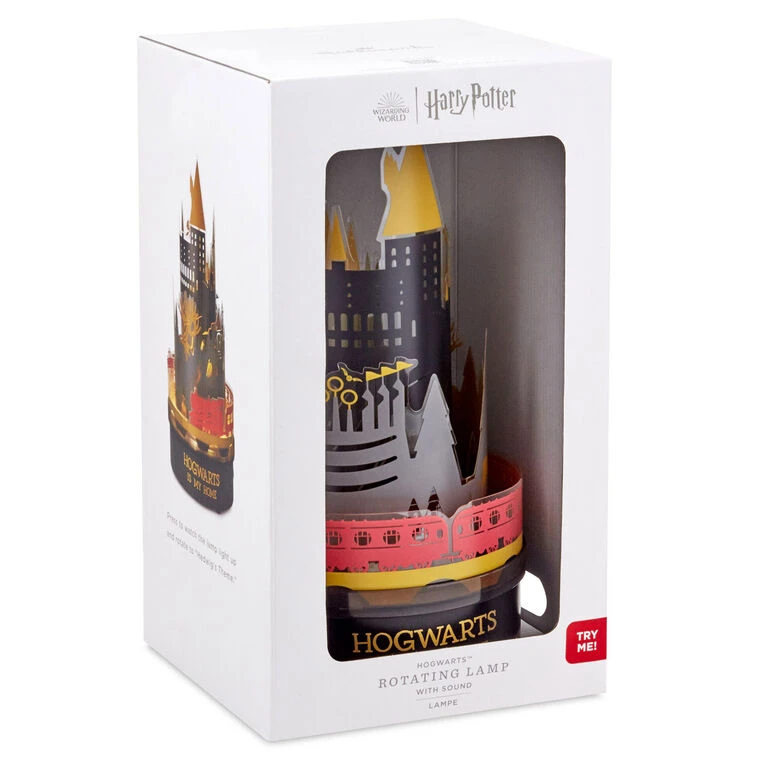 - Harry Potter rotating lamp with light and sound features a three-tiered design of Hogwarts School of Witchcraft and Wizardry.
