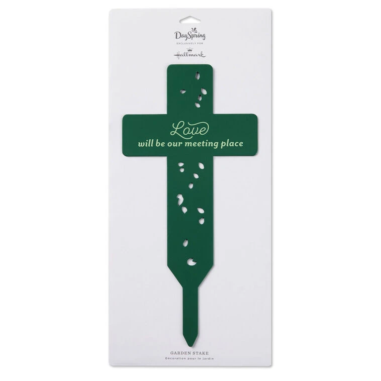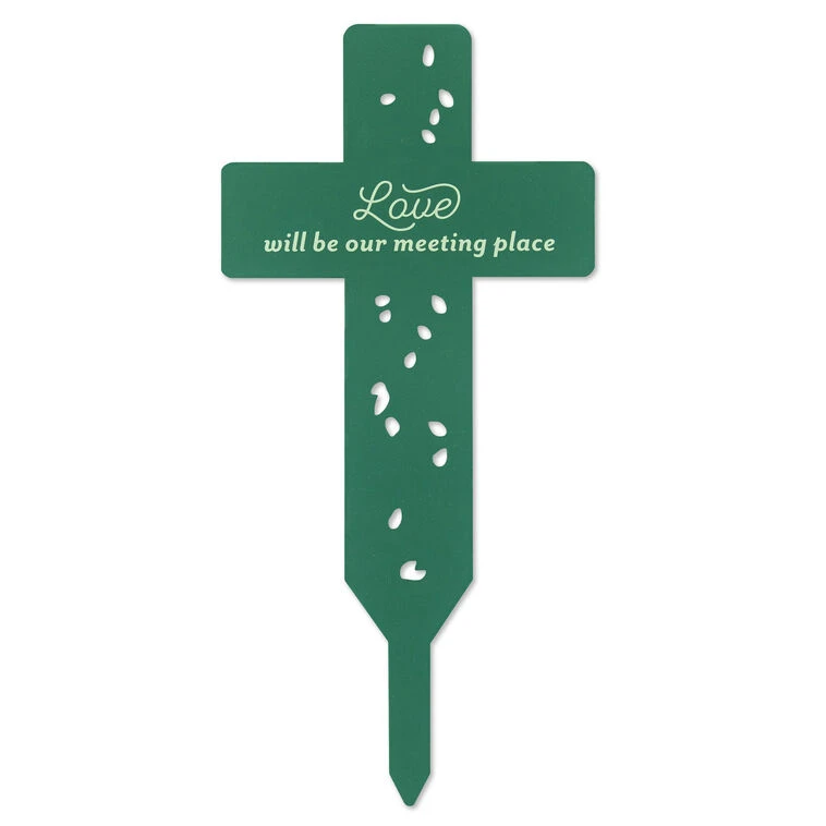 - Decorative garden stake features a dark green cross design with a message and cutout leaf shapes.