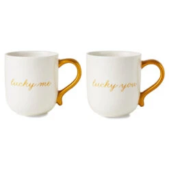 - Set of 2 mugs with shiny gold accents, curved handles and coordinating messages.