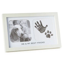 Show off a friendship for the ages with this double picture frame with a fun caption centered below the square openings. Each opening is sized to fit a 5×5 photo, or add a handprint and paw print to each side with the two inkless ink pads included with the frame. Whether you fill up the frame with pics of you and your dog, your kid and their pet or any combination of human and furry friends, this cute DIY frame makes a great display on your own home or office desk, or a great gift for a parent or pet parent.
