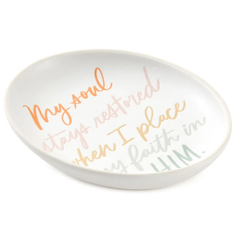 - Oval trinket dish features a colorful message of faith in debossed script lettering.