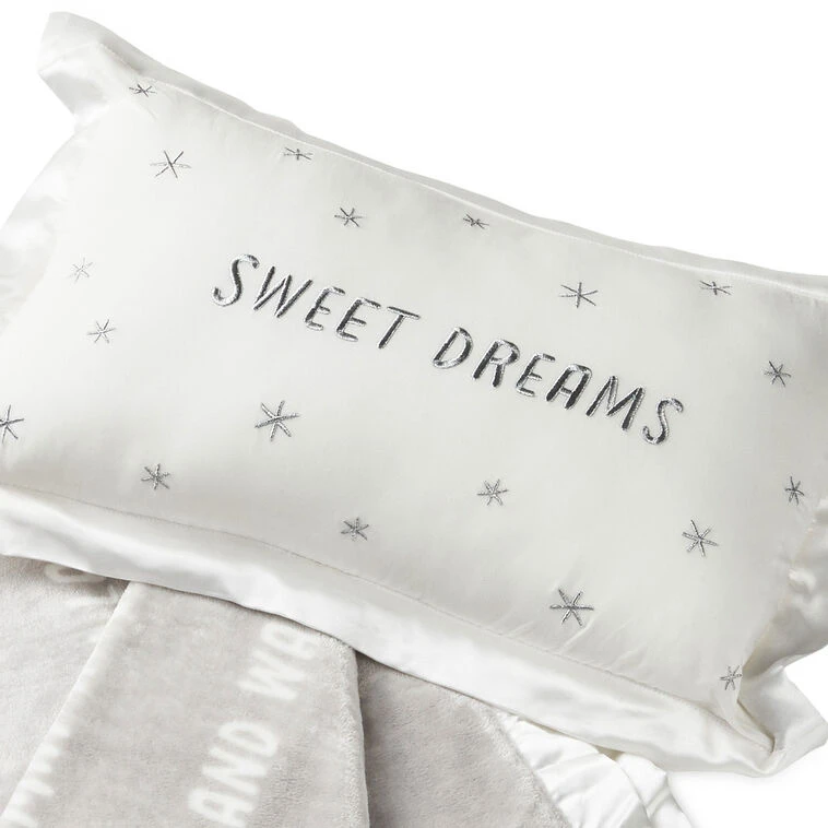 Spread blessings over a cherished child at bedtime or naptime with this sweet blanket and pillow set. Pastel gray fleece blanket features a nighttime prayer to watch over your little one printed in white lettering amid star designs and satin trim around the edges. The coordinating ivory satin pillow includes matching star designs and a “sweet dreams” message in silver embroidery. This lovely child-sized bedtime set makes a great gift for kids ages three and up.