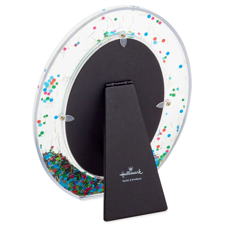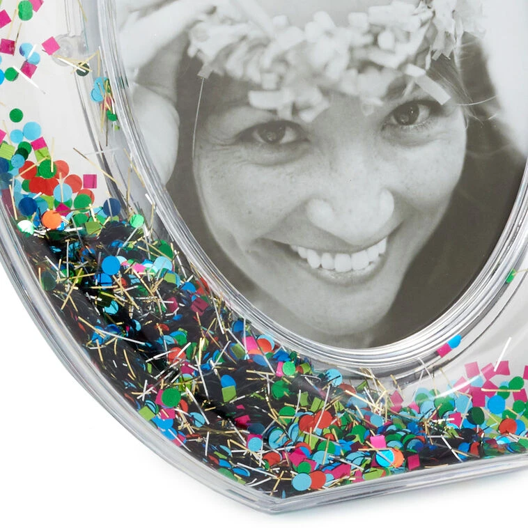 Surround a favorite photo in a festive display. This pretty, acrylic picture frame holds a vertical 4×6 photo and features colorful metallic confetti inside the frame’s oval border. Place a favorite snapshot inside and place it on a home office desk, dresser or anywhere you want to brighten up your living space. The cute frame makes a great gift for a friend, a college kid, a coworker, family member or anyone who knows that glitter and confetti make everything more fun.