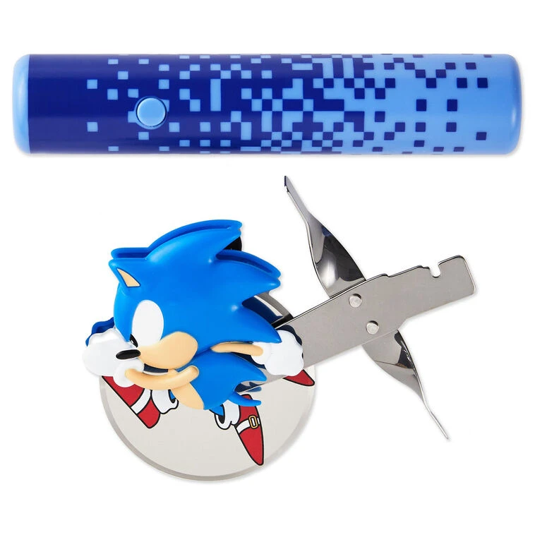 Speed through the slicing and get to the best part of pizza—the scarfing—with this Sonic the Hedgehog pizza cutter. Fun kitchen utensil featuring Sonic in an action pose plays the iconic sound of his spin dash when you press the value. Make your favorite gamer’s day with this Big Blue pizza slicer that’ll blast through everything from thin crust to deep dish in speedy Sonic style.