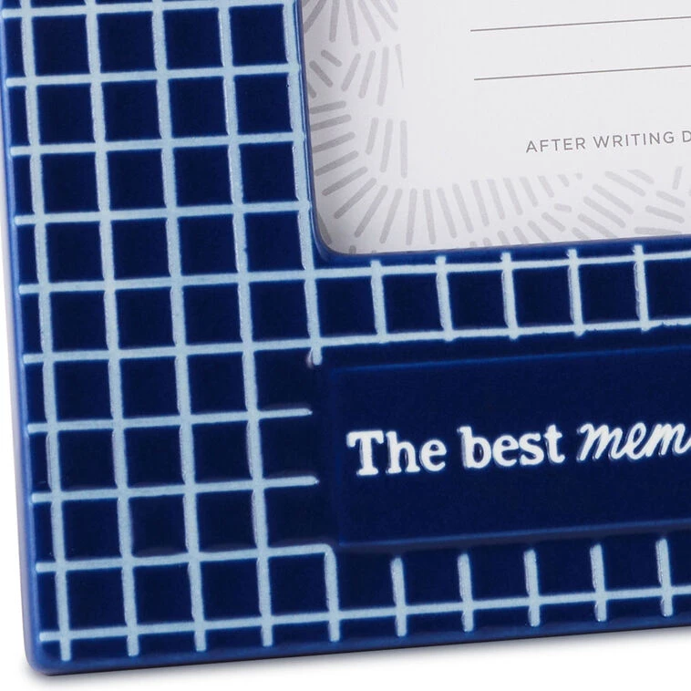 Celebrate a favorite moment shared together with this modern picture frame in blue and white. Ceramic photo holder features a gridded design of tiny dark blue tiles with white accents and holds a horizontal 4×6 photo of a friend or loved one. Unique frame features an embossed message below the photo opening and makes a charming addition to an office desk, mantel, side table or dresser.