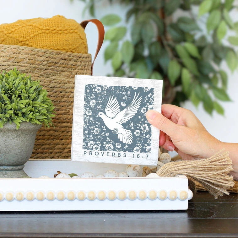 Be at peace with God in your heart, and that peace will be conveyed to everyone around you. This unique wood quote block from Sincere Surroundings features a dove design surrounded by flowers and a Bible passage from Proverbs sharing a message of faith. The pretty blue-and-white design makes a lovely addition to any home.